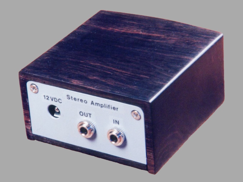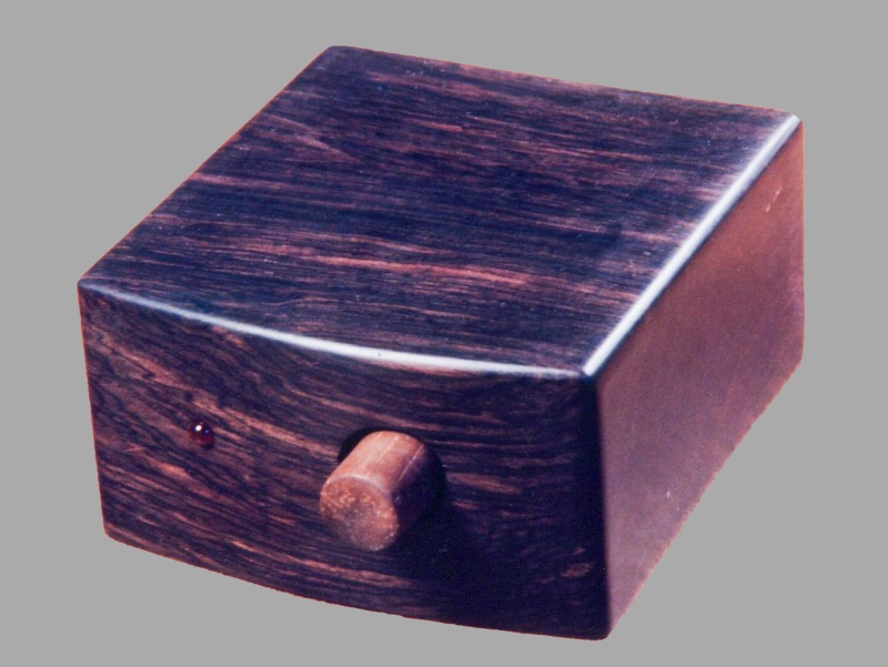 My father needed an amplifier for his PC speakers and I figured I could whip one up that would work for him. I ended up making a case from African Blackwood to house it. A knob made from Brazilian Rosewood was used for the volume control.