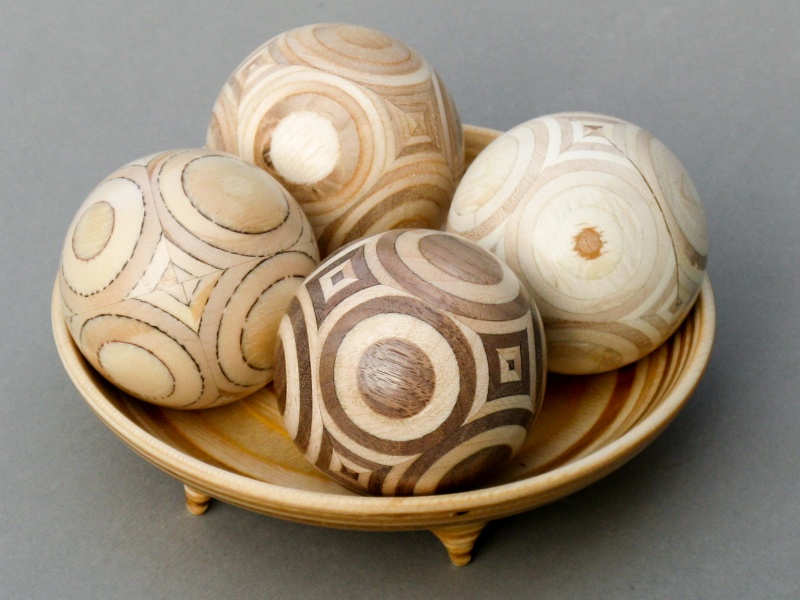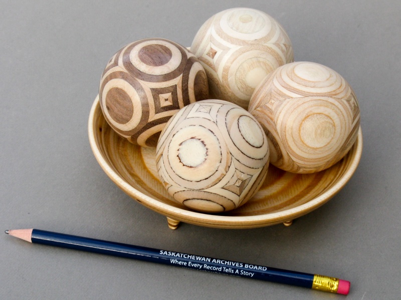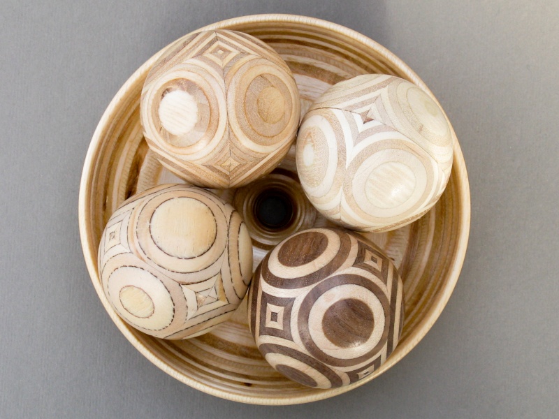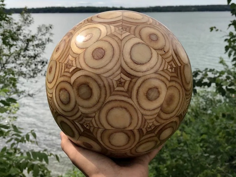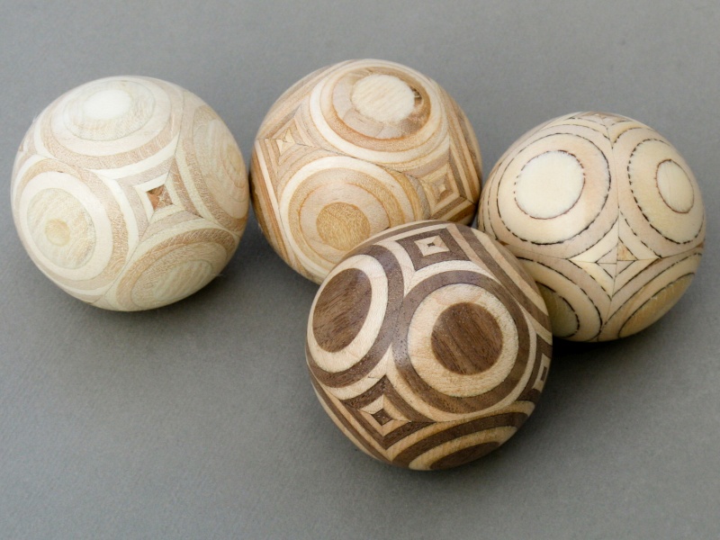 A buddy of mine sent around a link to a photo of an impressive wooden ball constructed from 60 triangular pieces of plywood (the one in the hand above). It is especially neat since the rounding on each piece produces a sort of contour-map effect from the wood plys. I considered making something similar but I don't get along well with precisely-mitered angles, so making a 60-piece fit-it-together-perfectly sphere wasn't something I particularly wanted to try.