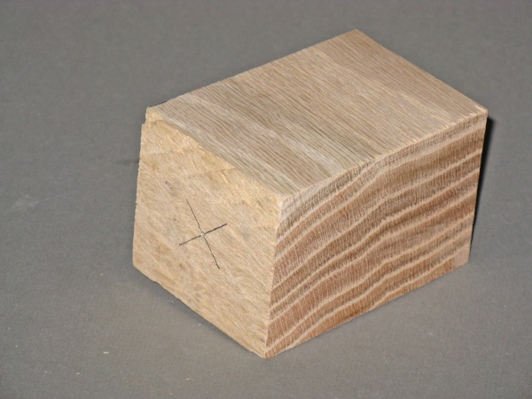 I start with a suitable blank (blank: [blaNGk] n; a roughly cut metal or wooden block intended for further shaping or finishing). A nice rectangular piece like this one is good since then it is simpler to find the center to maximize the size of ball it produces. This one was just cut out from a larger plank. I like to have at least 1/2" extra wood on both ends, but 1" is even better.