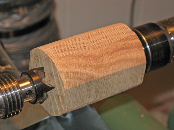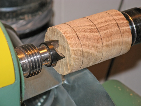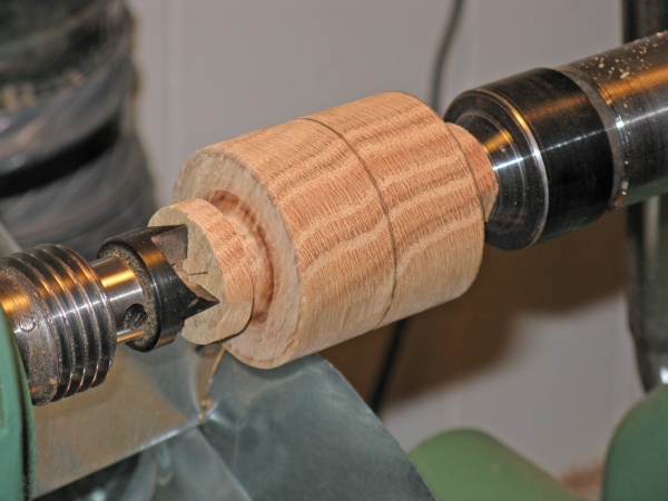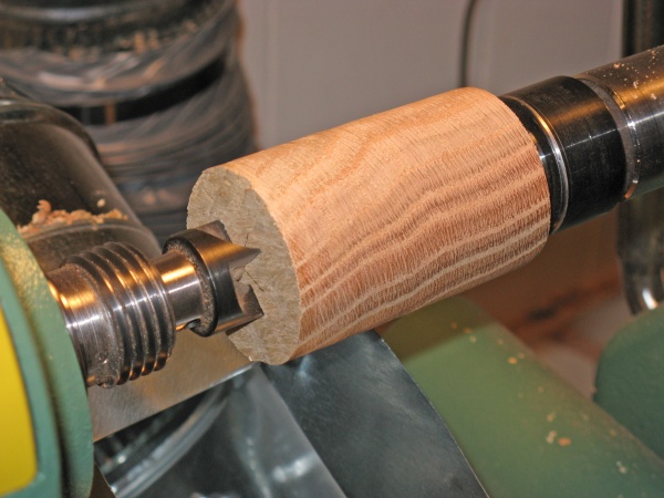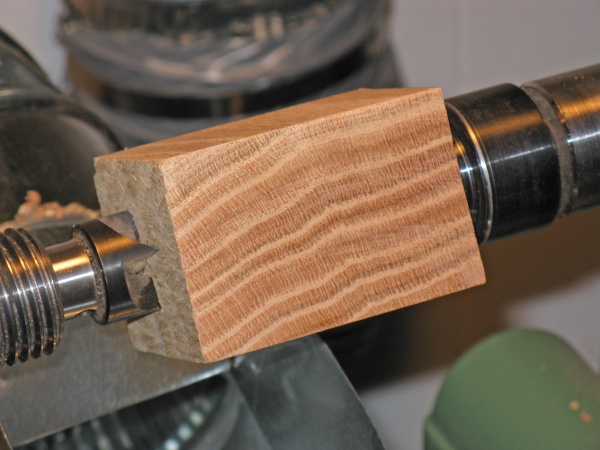 Here the blank is mounted "between centers". The points on the headstock drive center and the tailstock live center are aligned with the marked center of the blank. I usually knock the blank onto the drive center with a mallet until it engages with the spurs. Then the tailstock center is aligned and the tailstock tightened to hold things in place.