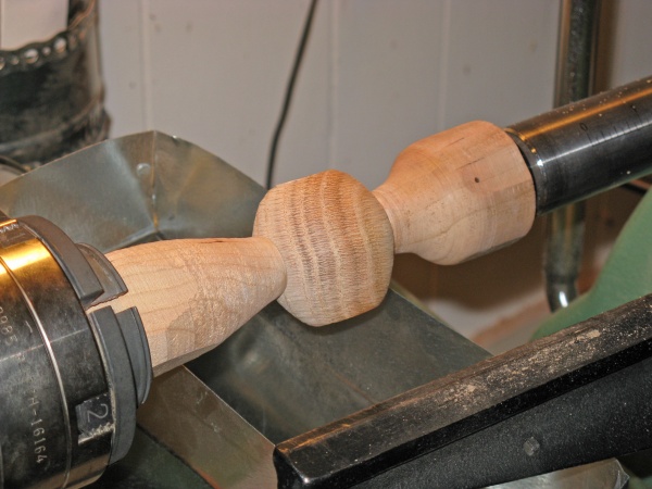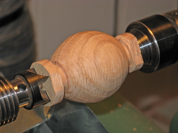 Now the cylinder is turned to as close to a sphere as possible. My particular attempt here was pretty pathetic, but the main thing is to try not to have any part too small. Too large is OK since it will be removed later. So egg and barrel shapes are preferable to UFO shapes.