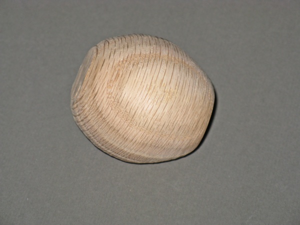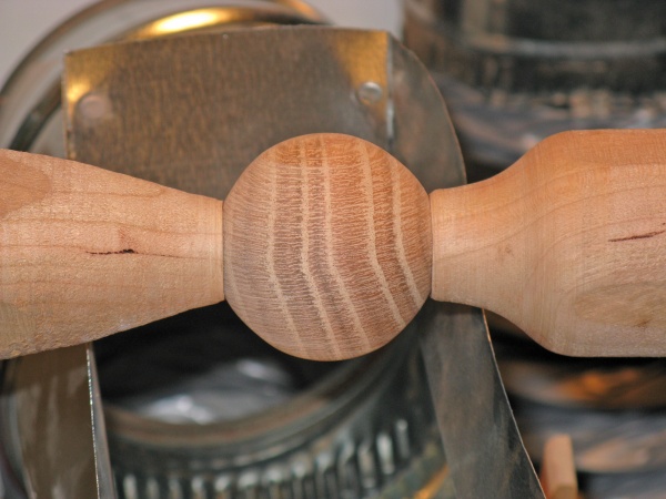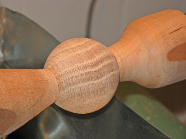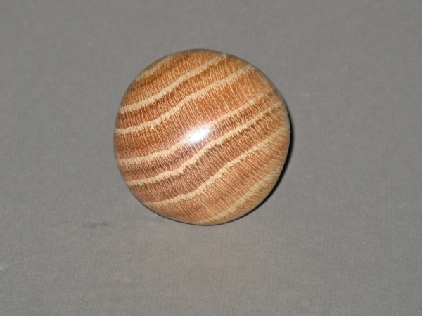This is the finished oak ball after waxing. It actually looks a bit out of round in this photo, although that's partially an effect of the shadows. However, it turns out that this ball is one of the least round I have made. It's diameter varies from 1.792" to 1.830" - a variation of 0.045". Most balls I have made vary around 0.025" from minimum to maximum diameter. That's not exactly ball-bearing material, but at least it's round to the eye and touch.
