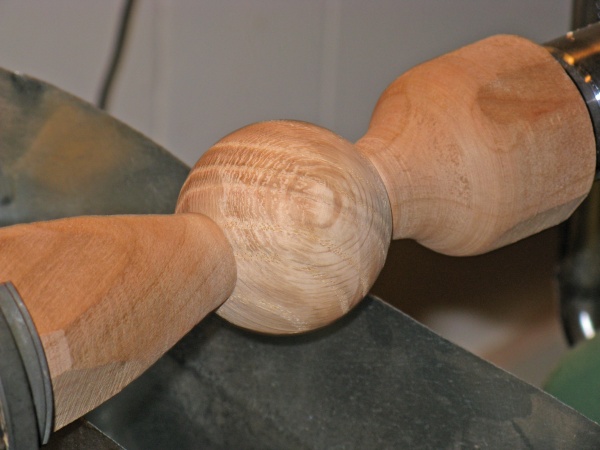 I usually use a beading tool for this operation. Ideally, the sections of wood left would have a diameter less than 1/3 of the ball diameter, but that's not always practical. With only 1/2" of wood at the ends, the centers still need some support so on this one I have cut a bit deeper, leaving a wider flange of wood for the spurs on the drive center. With more wood at the ends, this wouldn't be