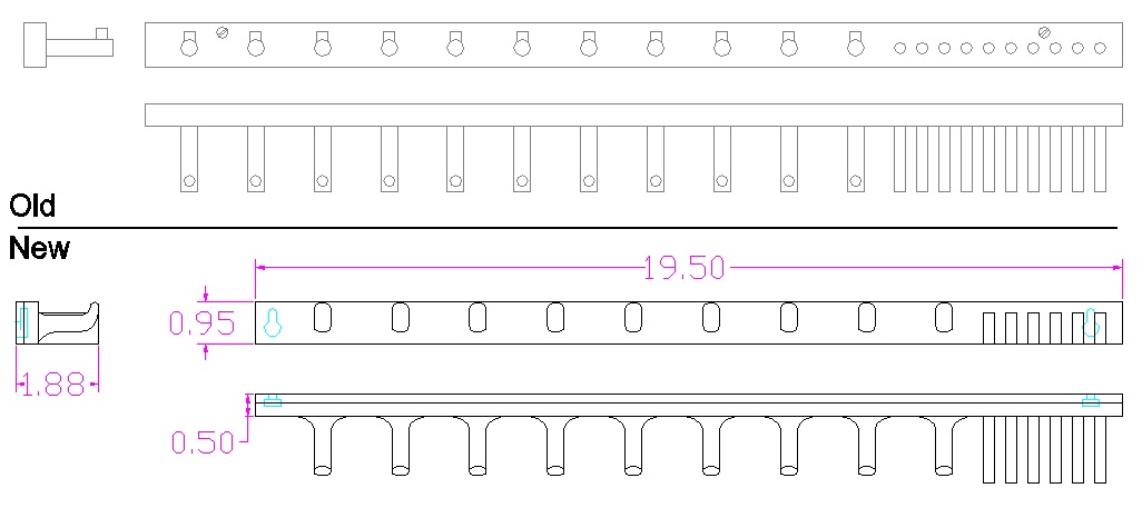 The current rack had rather more capacity than needed, especially for my now-reduced number of belts so the new one is a bit shorter and has around 30% less capacity. It probably still has more capacity than I need but I wanted to keep the same mounting hole locations which put the kibosh on further length reductions.
