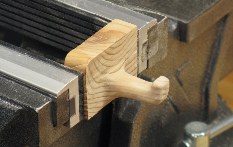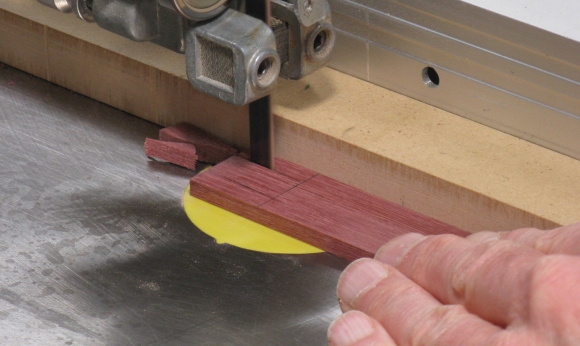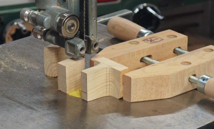 I started with a little block cut out of a construction 2x4 which gave a nice soft piece to work with. In this shot that block has had the hook profile cut into it on the bandsaw.