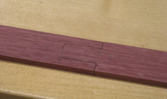 I had cut two strips for the back since a single one wasn't going to be long enough by itself. To provide strength in the area that would connect them, I cut a simple finger-joint (as in, 1 finger) so there would be about an inch of overlap of the two pieces. The joint ends were cut on the bandsaw and then trimmed by hand for a closer fit.