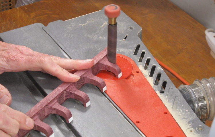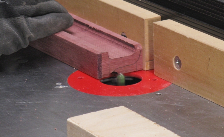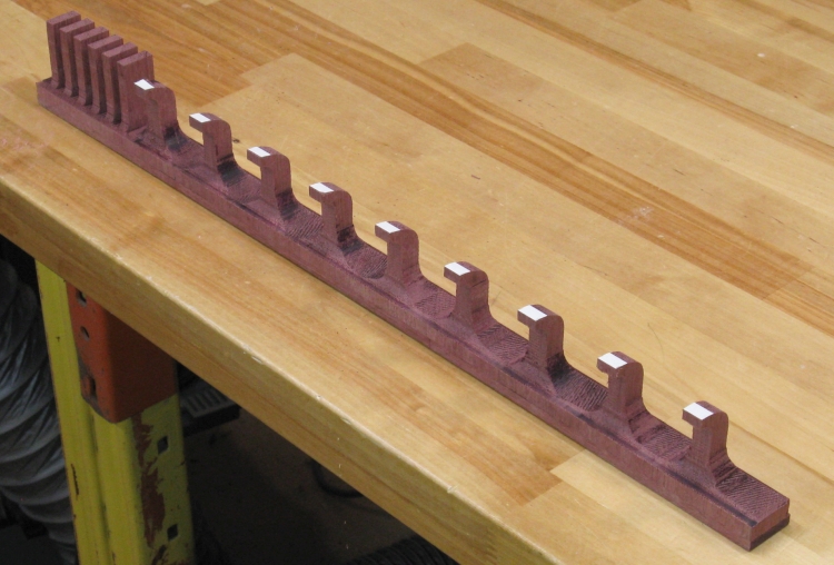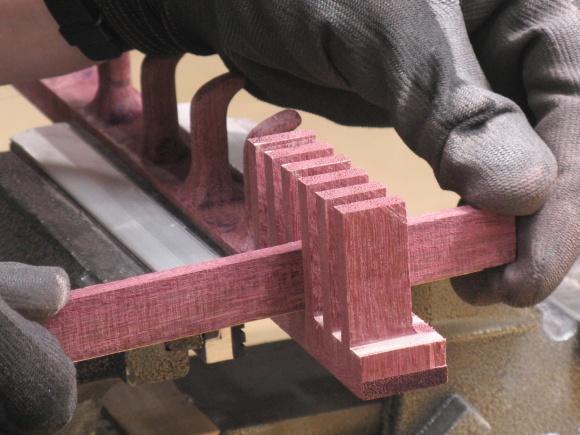 This shot shows the blank with the routing complete. The hook profiles are on the near end while the slots will be cut into the far end.