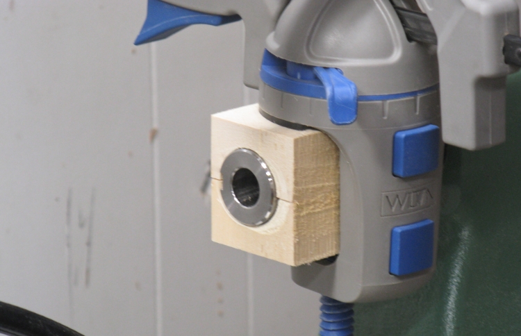 I needed another little jig to attach a vise to the lathe. The simplest way was to drill an appropriately-sized hole in two stacked blocks so the vise mount would squeeze them against the shaft.