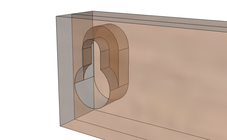 I didn't have a specialized keyhole bit so I used a three-stage procedure to cut the holes; First was a 3/8" diameter blind hole drilled with a forstner bit (to 0.27" depth). Next was to mill out the slot which was accomplished with the help of a 3/16" router bit. And the last step was the undercut, accomplished with the mini-circular-saw cutter which was inserted into the main hole and moved into the slot to undercut it. The cutter was only 0.05" thick so the slotting operation was done a few times at different depths to get the required slot depth of 0.15".