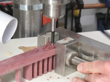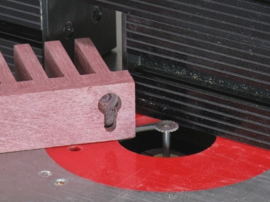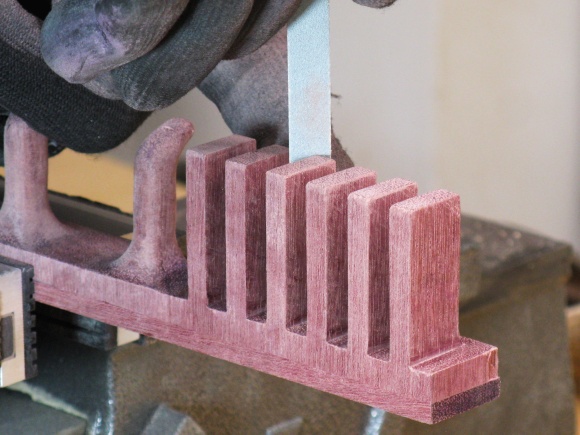 The profile of the hooks was produced by routing away the surrounding material. This shot shows the first cut which starts shaping the top side of the hooks.