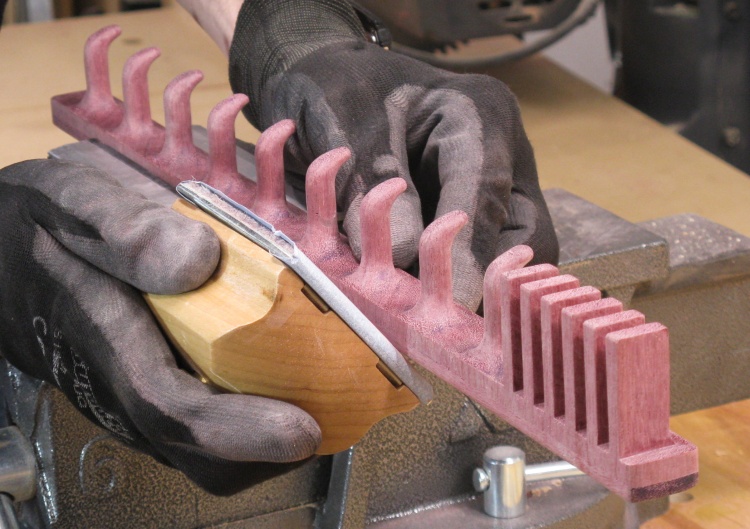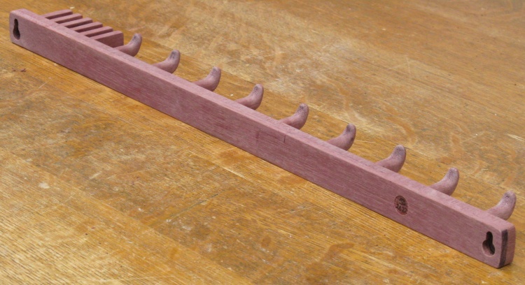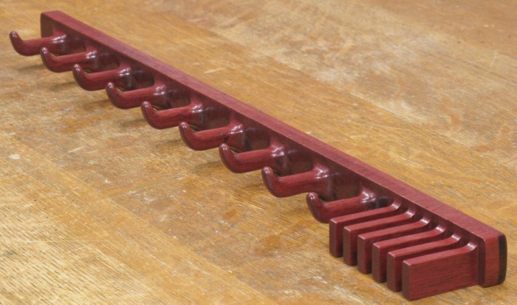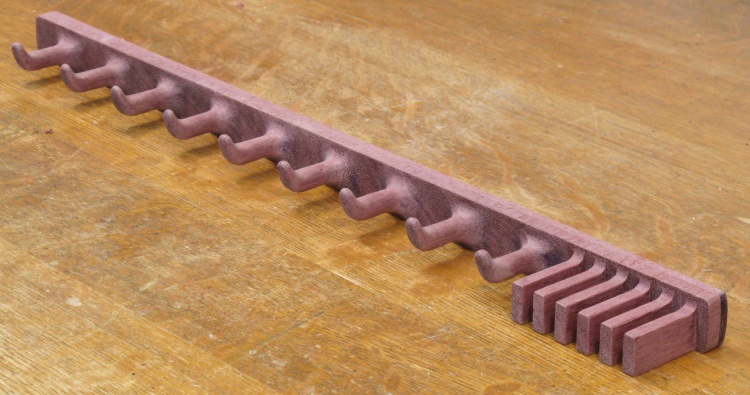 Purpleheart is quite a hard wood and the end grain (which comprises the face of the rack) is especially hard. To make matters worse, it seems to burn fairly easily with powered tools meaning that many of the previously-sanded inside corners were dark and needed to be sanded clear. Probably 90% of the sanding time was this operation.