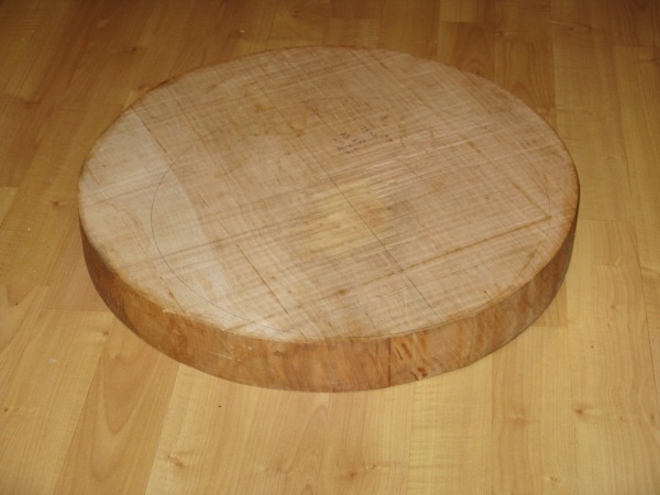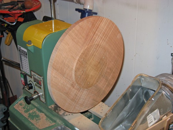 This is the bowl blank that I started with. It's about 17.5" in diameter, and I needed only 13.5". A faint pencil line can be seen showing the size of blank I needed.