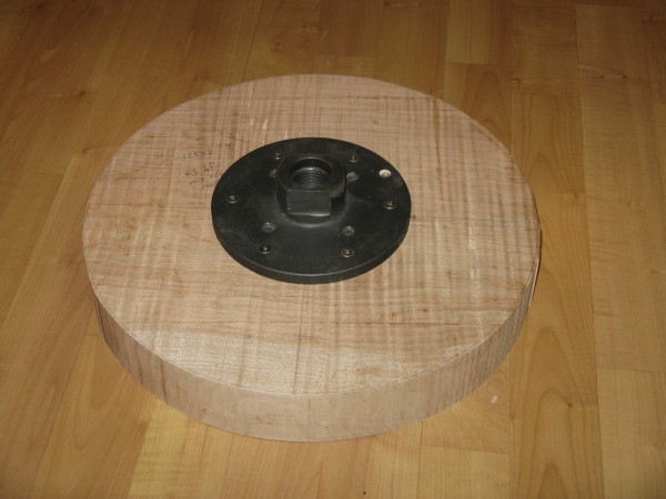 A metal faceplate was mounted to the blank for the first stage of turning. Since the bowl is so shallow, I used short screws to make sure they extended in no further than the depth of the bowl.
