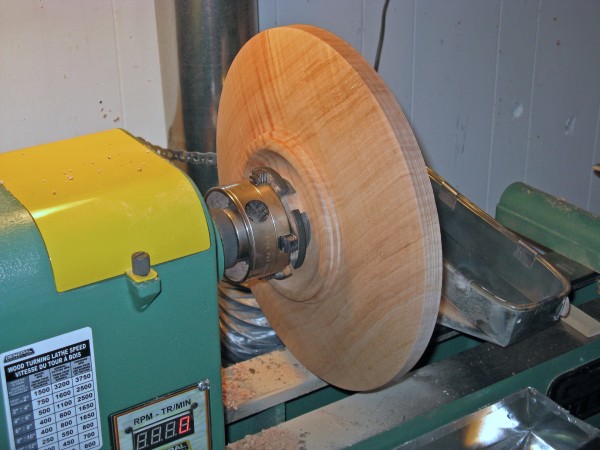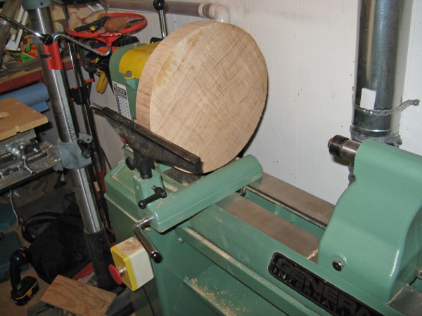 This shows the blank mounted to the lathe. It is a 16" lathe, which means 8" between the turning centerline and the bed so there are still a couple inches of clearance left.
