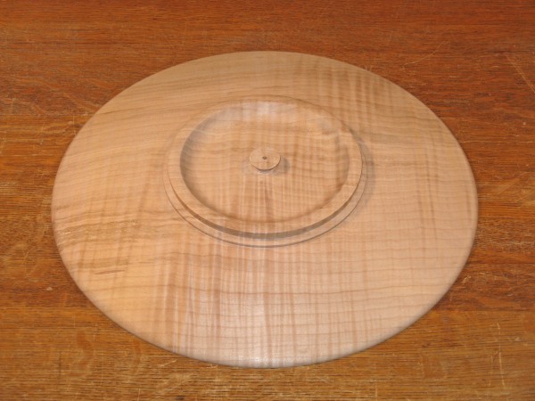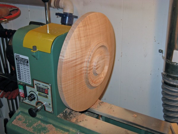 This shows the bottom completed, including the center tenon. It has already been sanded, as can be seen from the sawdust on the lathe.