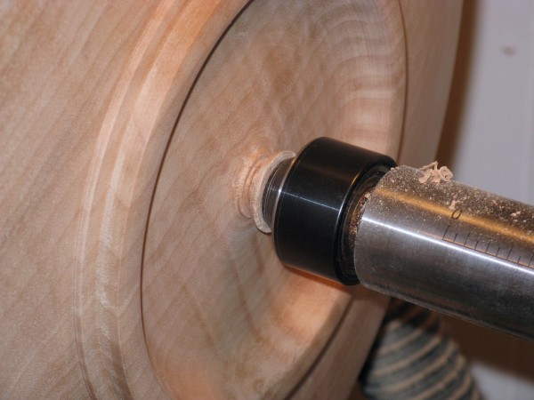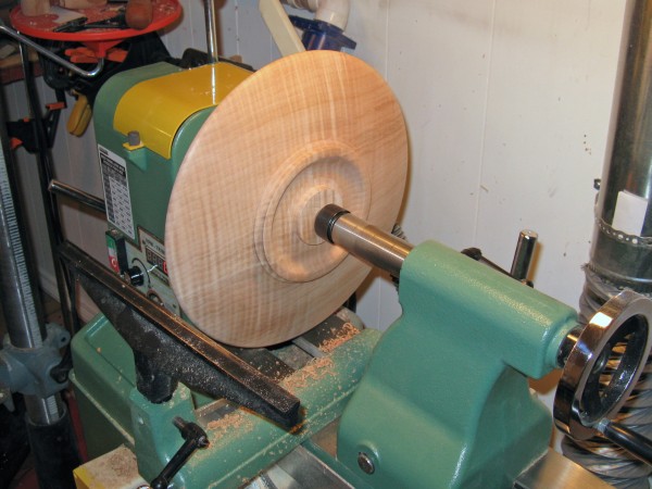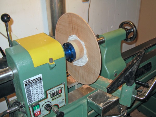 with some spongy material, and the bowl was squeezed between the disc and the live center in the tailstock. This let me cut off most of the tenon.