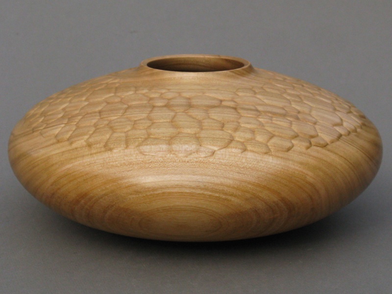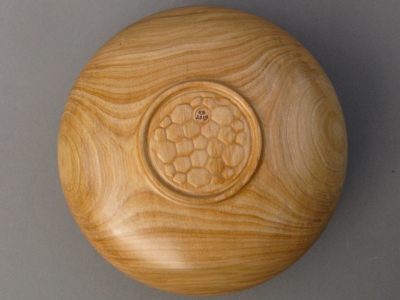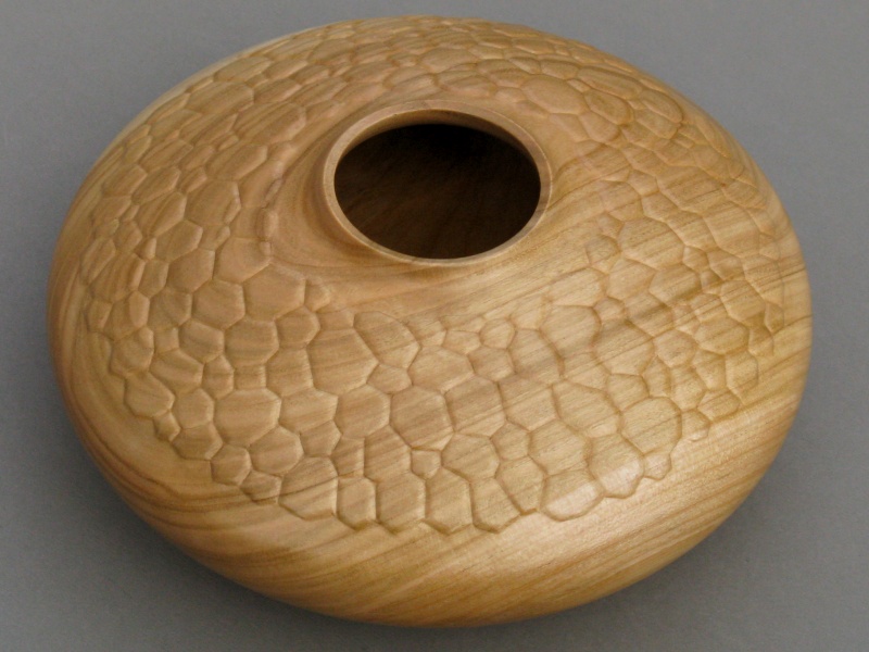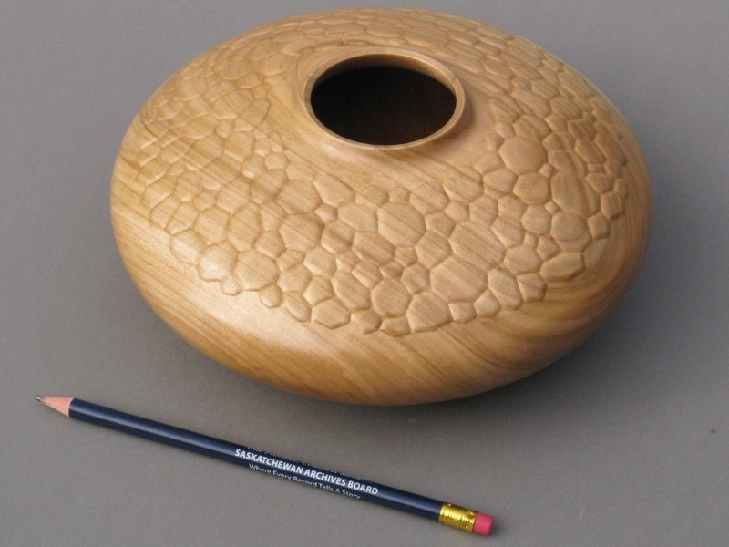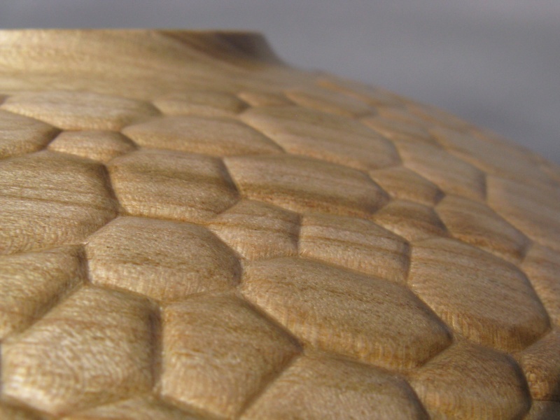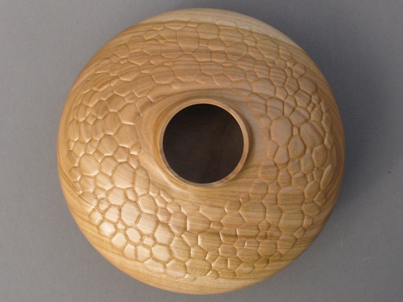 The original piece was to be pierced and I originally had the same intent for this one. However when looking at images of bubbles for the pattern, I decided I liked the surface profile of the bubbles so I switched over to having a contoured surface instead. The piece was just turned and carved although those wanting a bit more detail can look