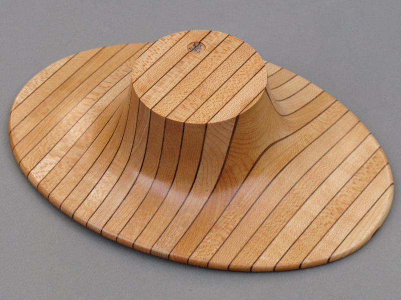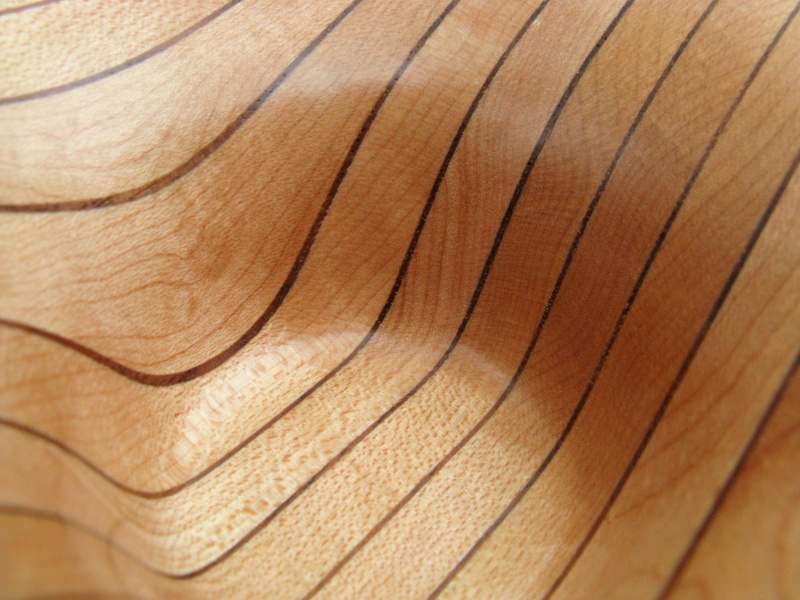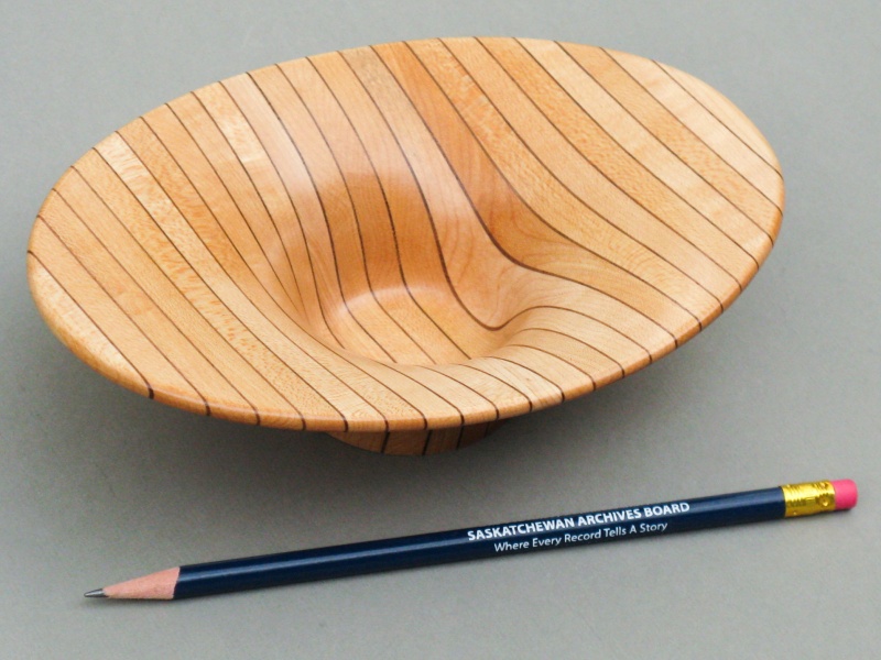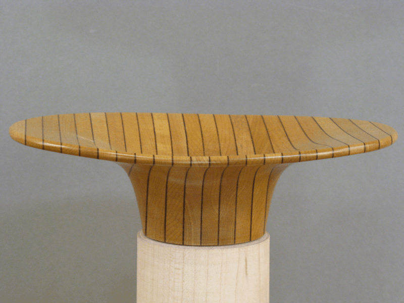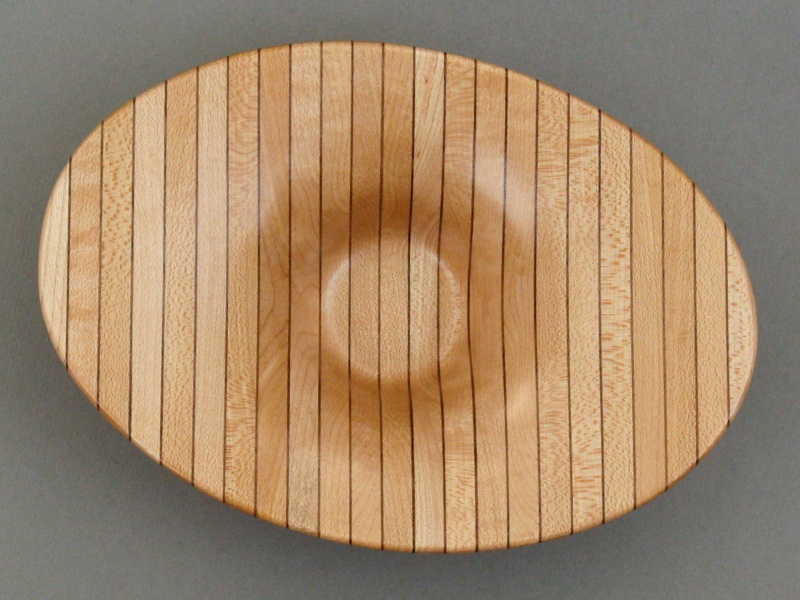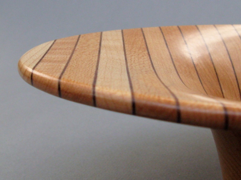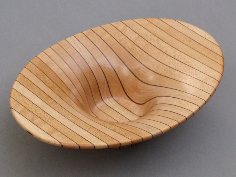 trivet but there was lots of wood left over and this is the second piece made with the planks. In contrast to the practicality of the trivet, this one is a decorative (i.e. impractical) bowl with thin maple pieces laminated with walnut veneer. I like the look of the dark veneer pieces as they traverse the curved contours of the bowl.