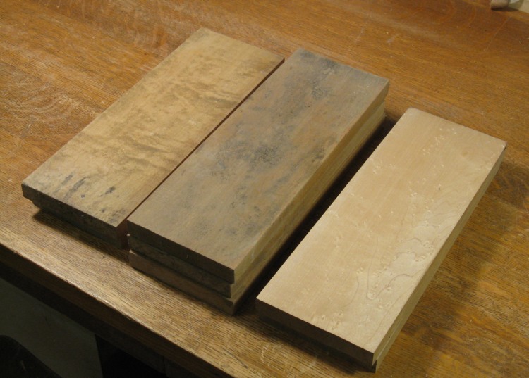 Here is a pile of the planks, although I needed only four of them for the bowl. The rightmost one has had the finish removed and so is rather cleaner looking, but even through the dirt you can see that there is a fair amount of board-board grain variation evident between the pieces.