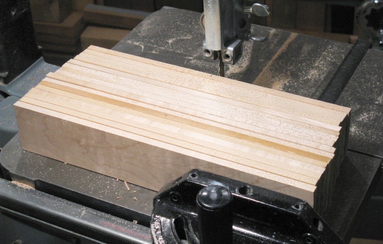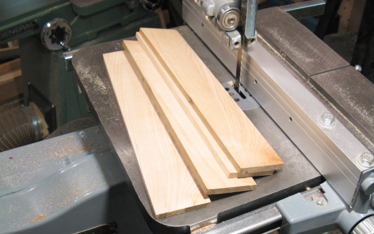 I selected planks that were at least twice as long as I needed so I could get eight laminations out of each piece. Here the four planks have been quartered and are being cut the long way.