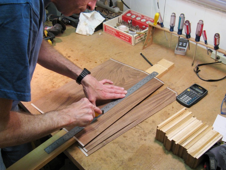 The next step was to cut up some veneer. I had a couple pieces of walnut left over veneer from a previous project and one of them was exactly enough for what I needed. The veneer was only 20 mil thick (0.5 mm) so I just cut it using a utility knife. Off to the right is the pile of maple-or-whatever laminations waiting to buddy up with some walnut.