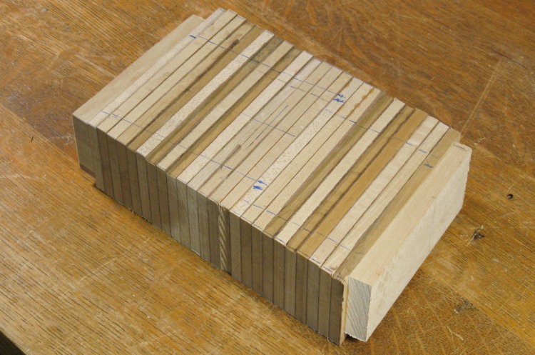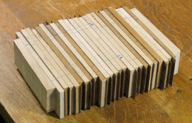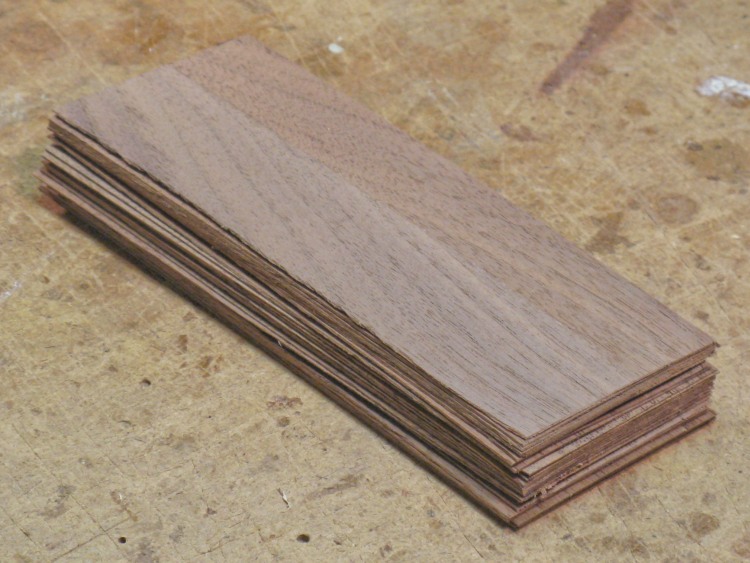 And here's the little pile of veneer pieces. They were cut a bit oversized compared to the laminations to avoid the need for precise alignment when gluing up.