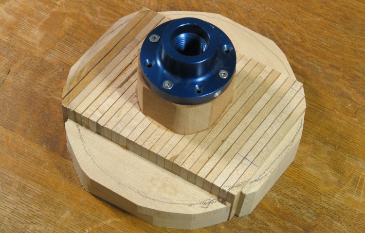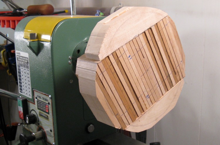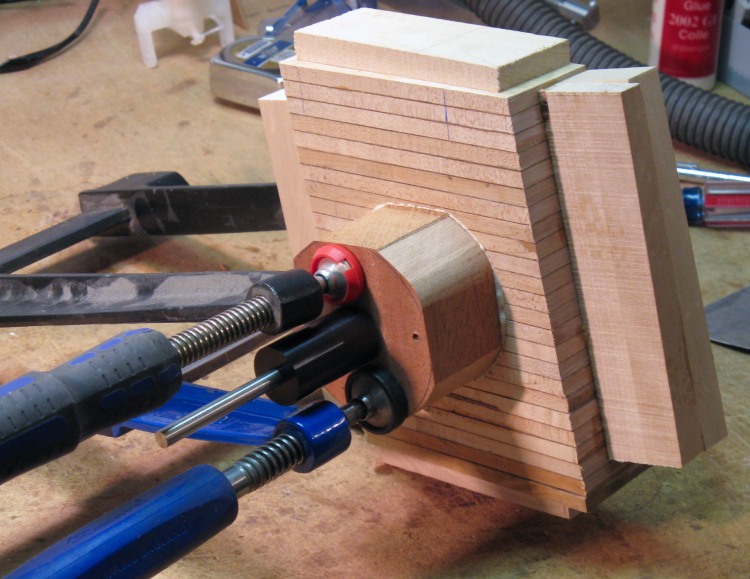 For consistent turning I wanted a full circle of wood so that the cutting tool was supported all the way around the piece. I could have accomplished that by making a much larger laminated blank, but that would have just been wasted work. Instead I just added some solid wood pieces on the sides as this photo shows.