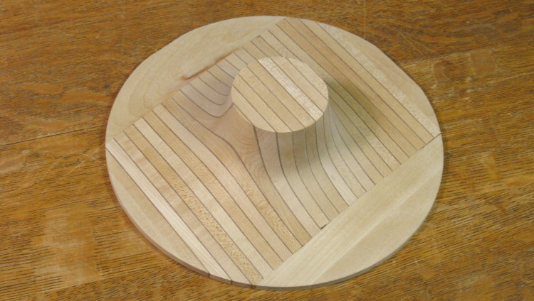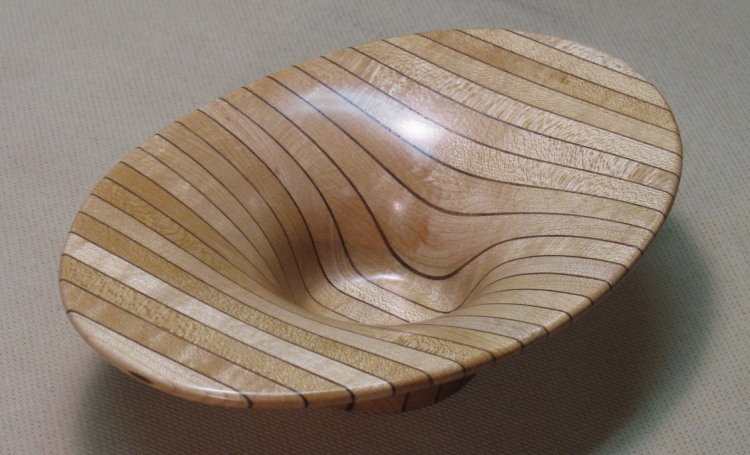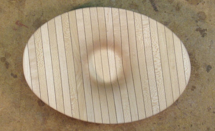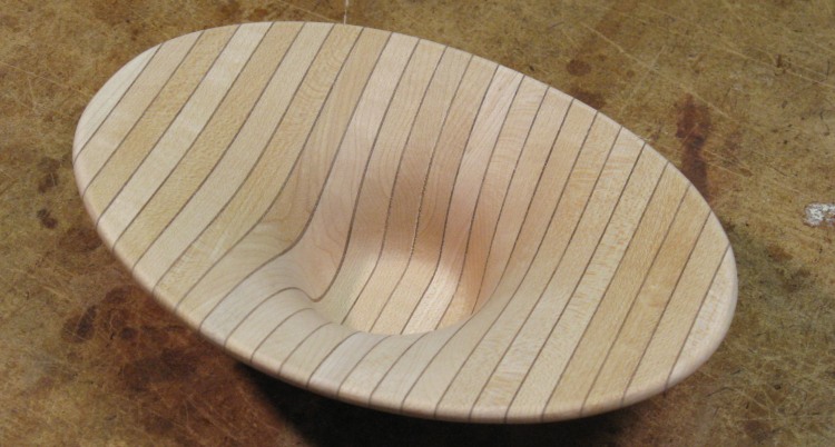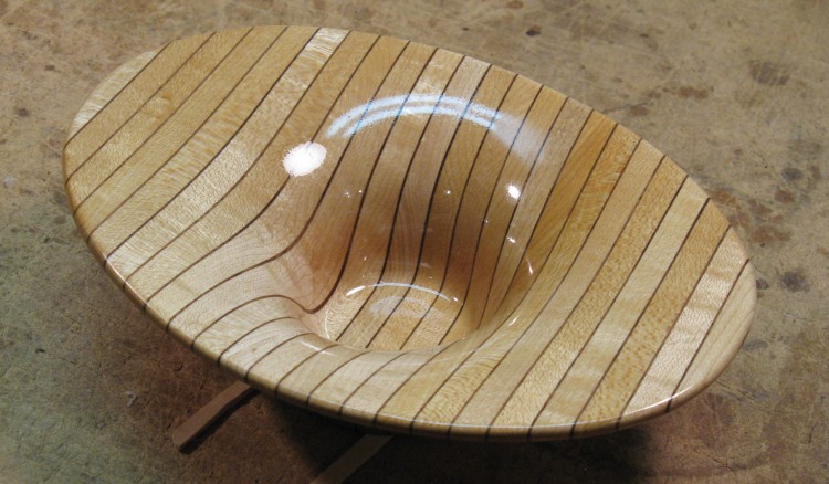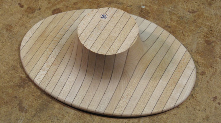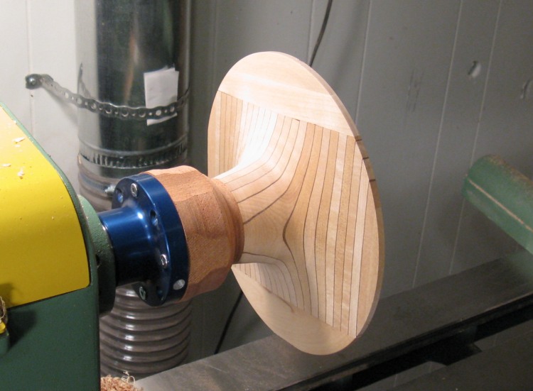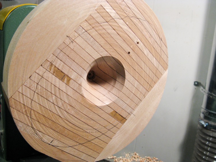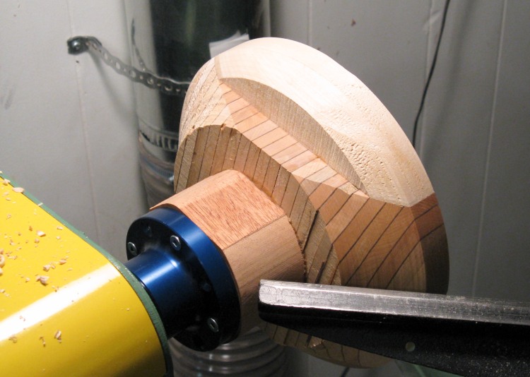 I had in mind for some time to make a turned laminated piece, so that seemed like another reasonable application for the planks. The design of this one was inspired by some pieces by Virginia Dotson, who has done some sophisticated laminated turnings. I wanted the laminations to be obvious so that meant alternating the light wood with a darker layer. For the contrasting wood I used walnut veneer which I conveniently had left over from a previous project.