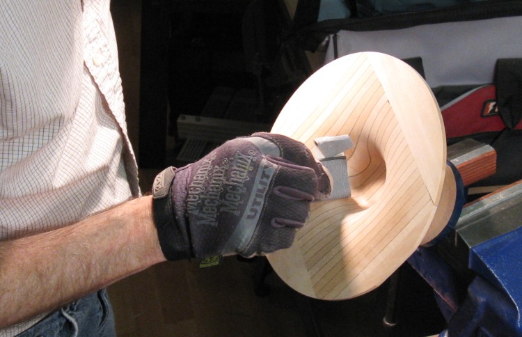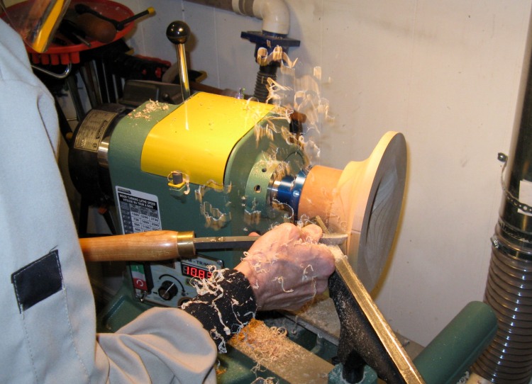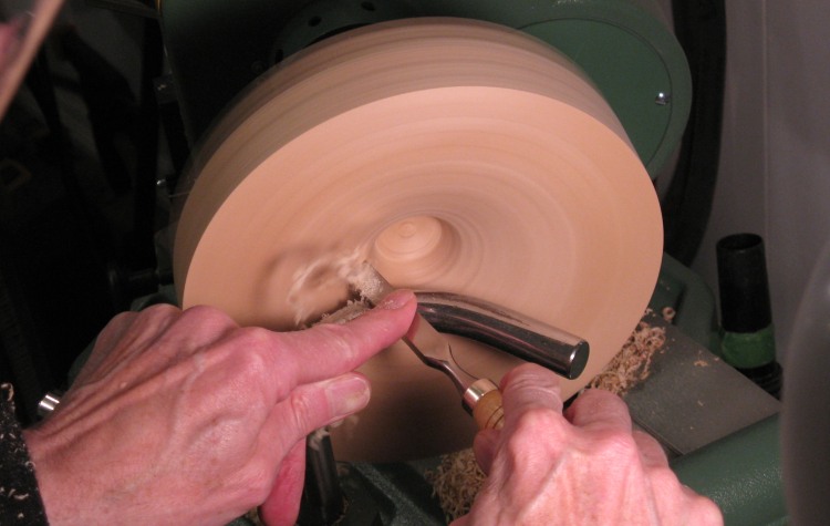 Here I'm using a home-made scraper (reground from a cheap chisel set) to shape inside of the bowl.