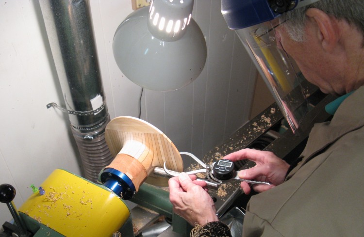 Using the inside of the bowl as a reference, the bottom was turned to get down to the desired wood thickness of about 0.2". I did a bit of cutting and then stopped and measured the thickness, working in from the edge of the bowl.