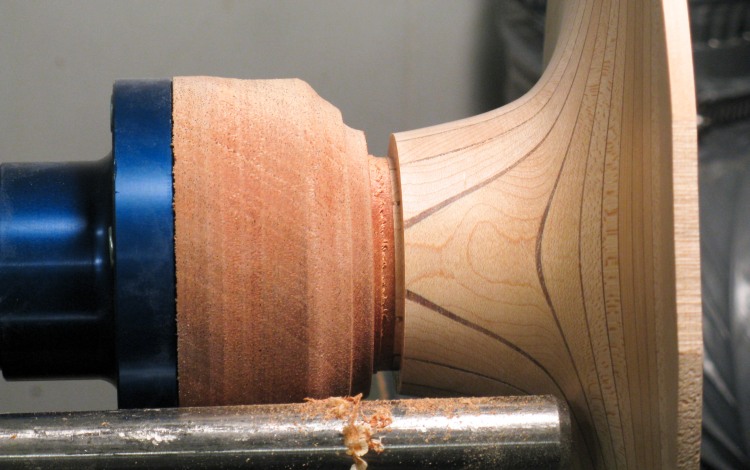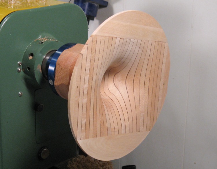 The more conventional process in bowl-turning is to shape the outside first and then cut the inside contour to match. Here I did it in the opposite order since it was the inside of the bowl that was the focal point, and I wanted to make sure the inside contour looked good.