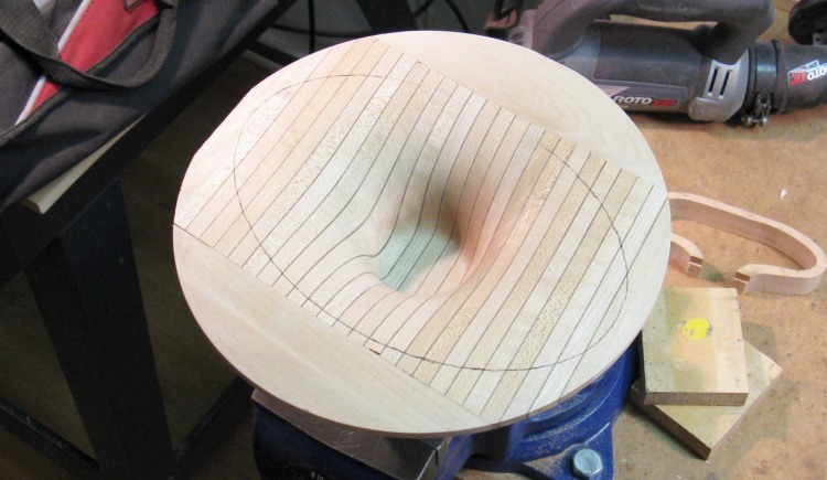 With the bottom cut I moved on to the top, marking it to the desired outline using the plan traced through carbon paper.