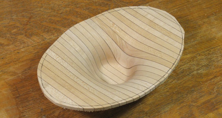 With the inside mostly done, here I've switched over to doing the outside. I've already started to remove wood as can be seen by the bevel on the laminated sections.