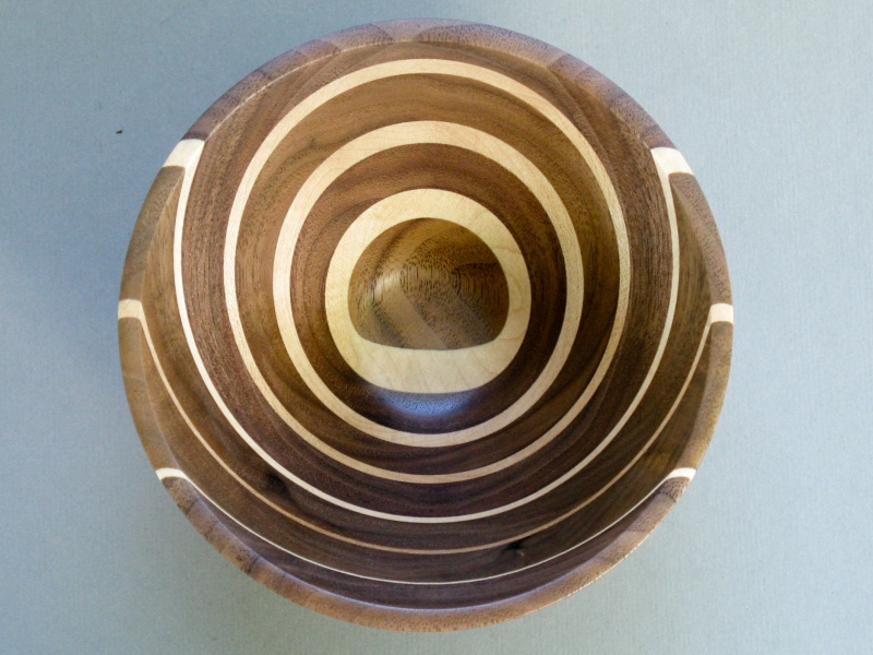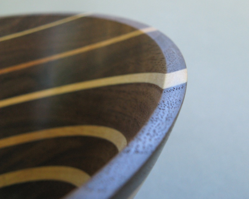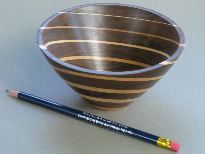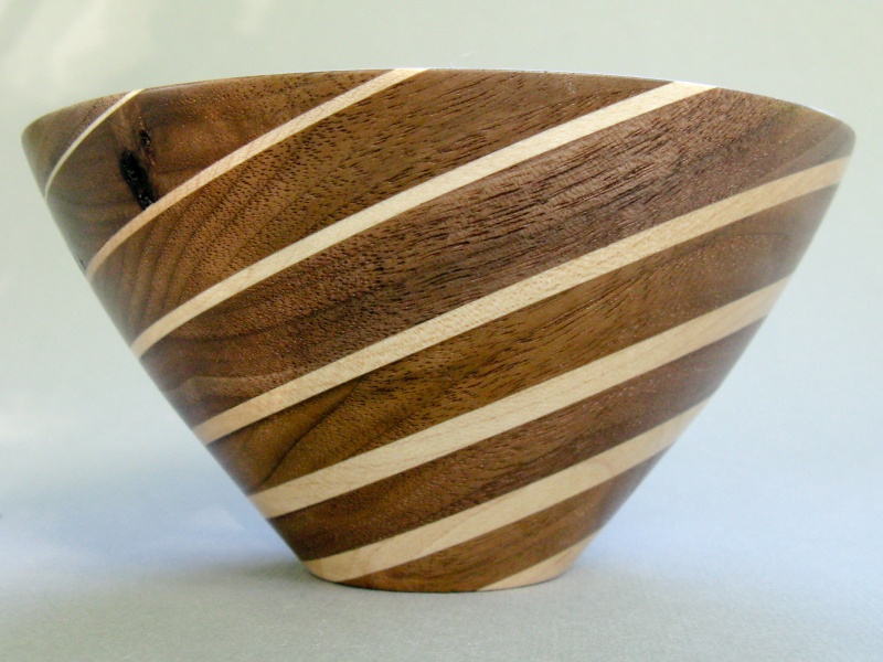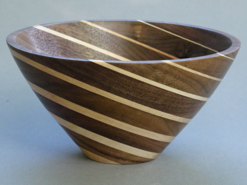 I dug it out recently, and after considering various possible shapes and the angle of the laminations, I settled on a wide-mouthed bowl for the shape. The trickiest part was mounting the oddly-shaped piece to the lathe at the proper angle. After that, it was a pretty straightforward turning process. Some construction details can be found
