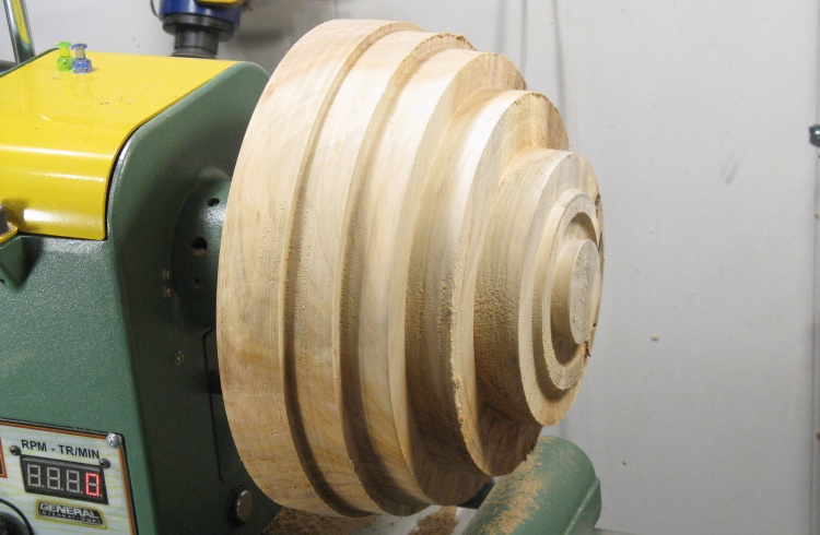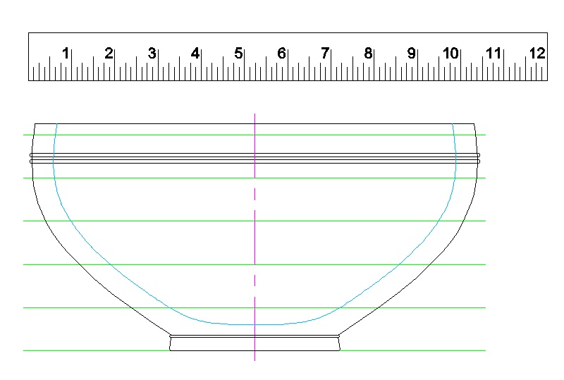 But in this case I used the bowl gouge to make a stair-step shape instead, with the inside corners being the reference diameters (the bowl diameters at the green lines on the plan).