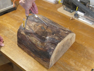 My large lathe is a "16-inch" model which means the center is 8" above the bed and you can turn something up to 16" diameter. Unfortunately the corners of the log were more than 8" from the center so they needed to be trimmed so the wood could rotate freely. I marked a center point and drew a 7" circle with a large compass and then trimmed the corners to that line.