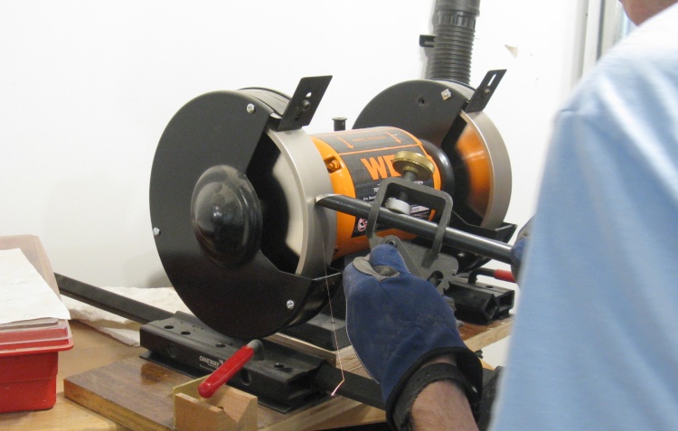 One of the the first steps in doing a turning is to sharpen the tools. Here I'm sharpening my large bowl gouge on the grinder. The camera managed to catch one lone spark heading down.