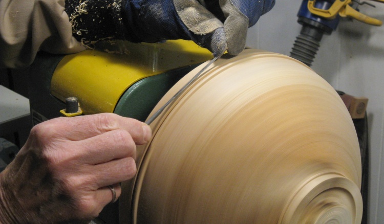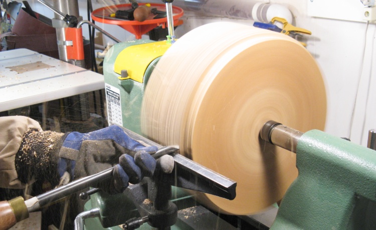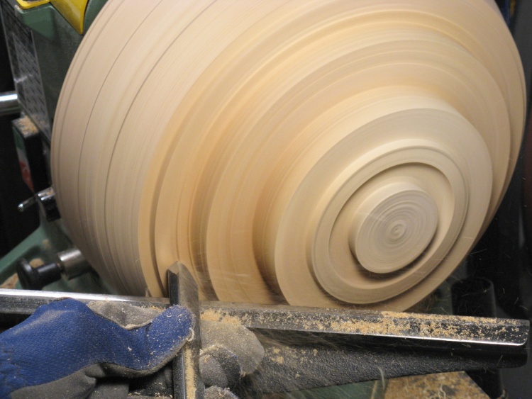 This photo shows the gouge moving across the piece and the little blurs are flying shavings cut from the closest edges.
