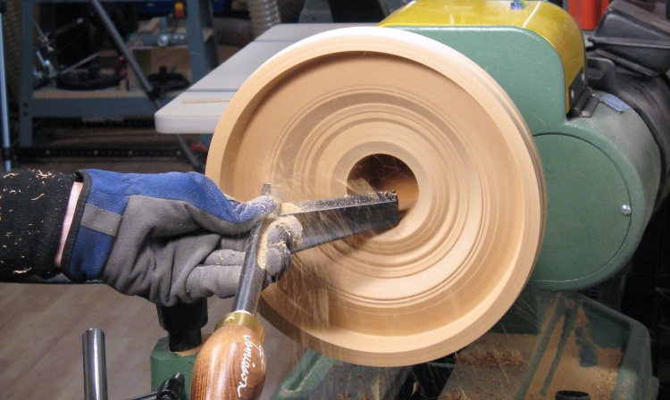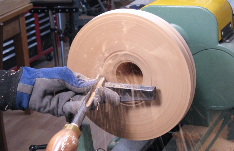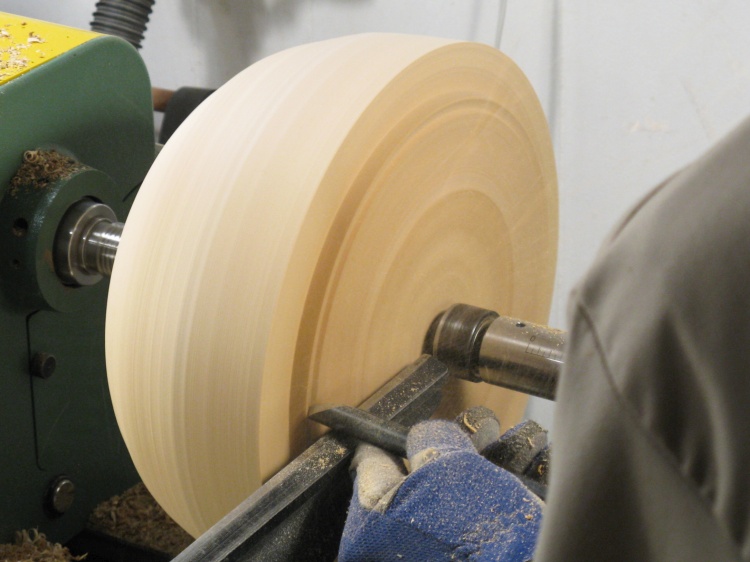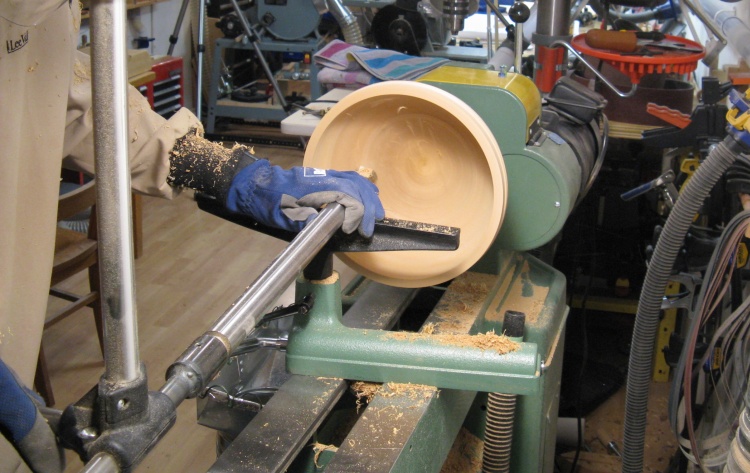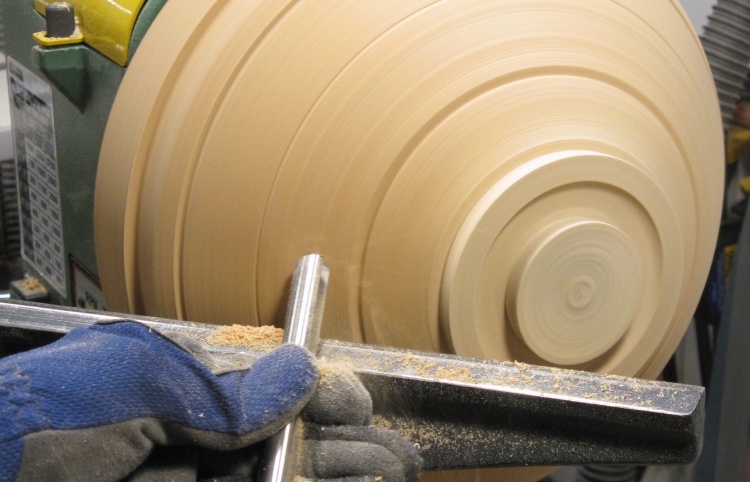 I often use a large roughing gouge to do the initial rounding but I thought I'd try to stick with the bowl gouge for this piece.