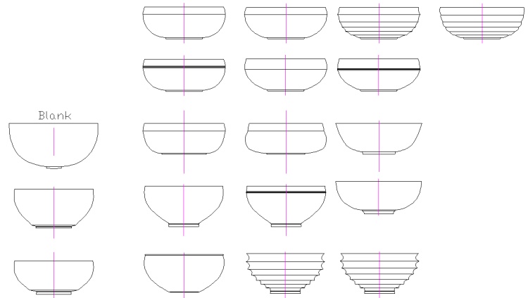 The number of possibilities for bowl shapes is pretty large, so I narrowed that down and drew up several of them to see how they looked. I leaned towards the ones that used up most of the blank because if you have a large blank with a, well, blank slate, you might as well use it.