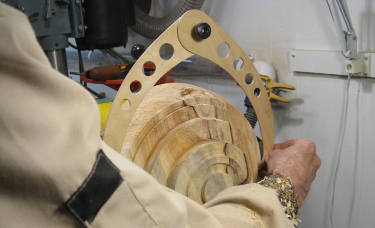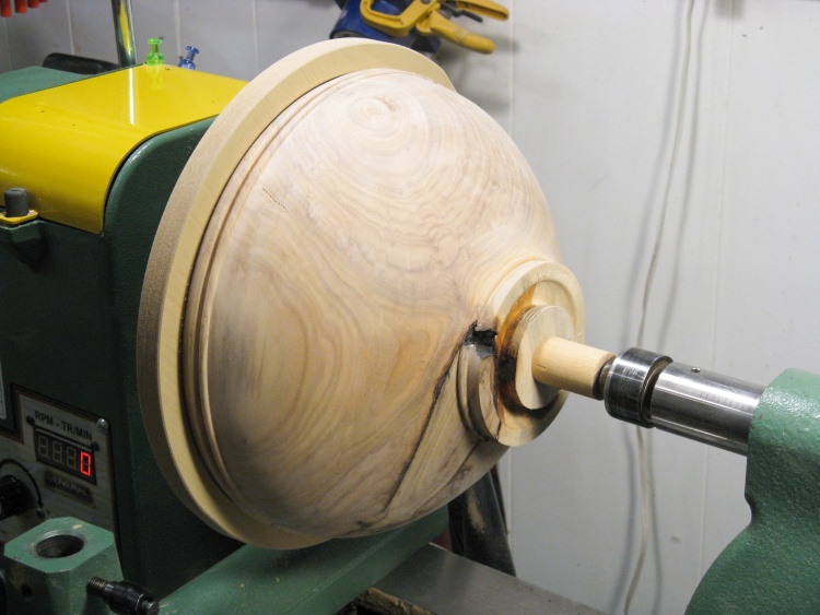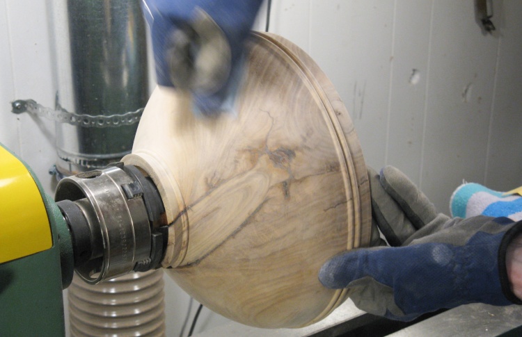 Here the bowl has been flipped around and fit into the slot in the jam chuck. This took a bit of fiddling due to the imperfect state of roundness of the rim.