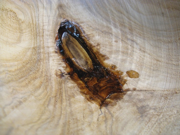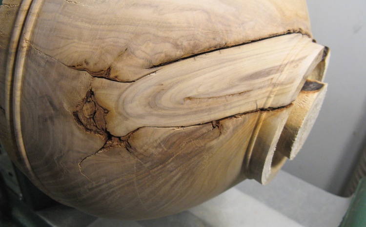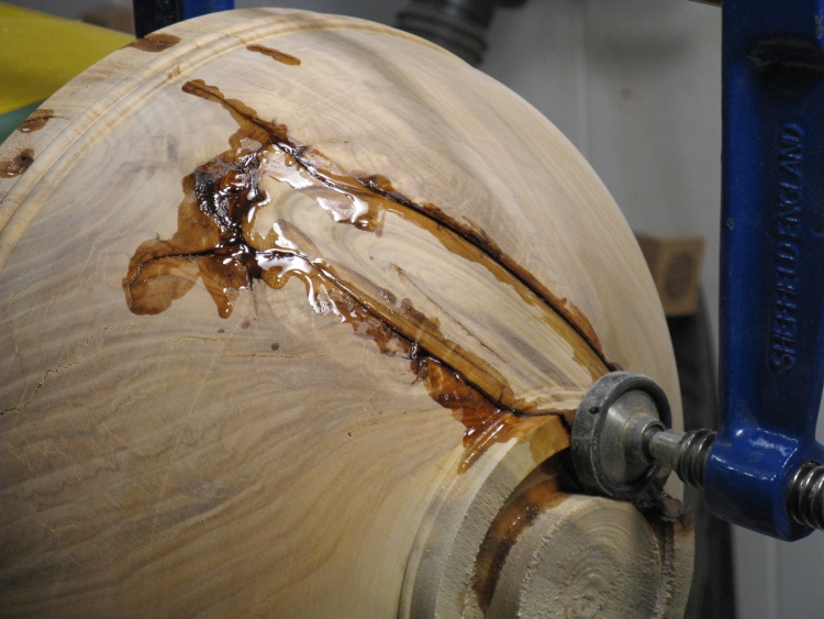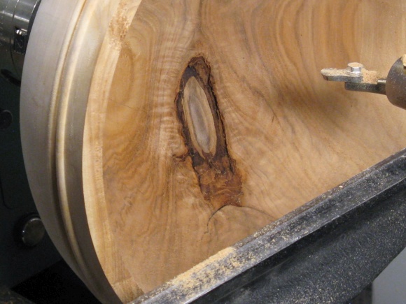One consequence of using most of the blank was that the bottom section had a piece of branch embedded in it. There was a thin bark layer around this section and it wasn't well-attached to the rest of the wood. To make sure it wasn't going to fly apart, I was going to need to glue it into place.