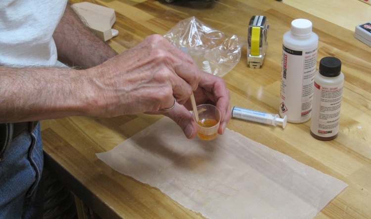 The plan was to use epoxy to fill the cracks which in addition to gluing the branch in place would provide a smooth surface for the finish. Here I'm mixing up a 10 ml batch.