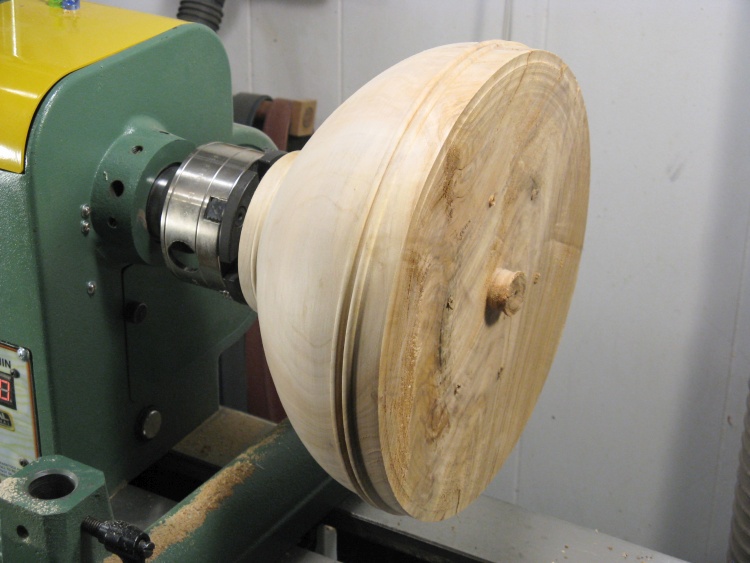The bowl was pulled off the lathe and the faceplate was removed. The wood went back on the lathe flipped around, now with the bottom tennon gripped with a 4-jaw chuck.