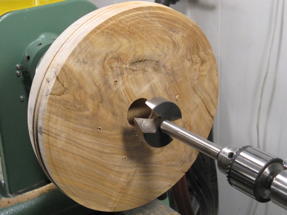 Hollowing typically starts with drilling a hole to make the process easier. I started with a pretty large bit (1-1/2" diameter) and drilled a hole, then switched to the Mother Of All Bits (as Saddam might say); a 2-5/16" Forstner bit acquired years ago to make holes for clock mechanisms. That made quick work on the inside couple of inches.