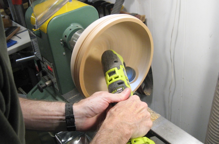 Both inside and outside were first sanded with the bowl spinning as above and then again with the lathe stopped as shown here. When stopped it was easier to see any scratches that needed to be sanded out.