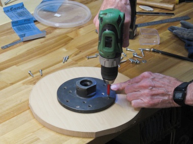 The last major operation was to remove the bottom tennon. I would need access to the bottom which meant flipping the bowl around yet again, which in turn meant that I needed a jam chuck - a flat piece with a slot that tightly fit the rim of the bowl. For the jam chuck I cut a piece of surplus MDF shelving material to size, rounded it on the bandsaw and added a faceplate. Then (off-stage) a suitable slot was cut into it to tightly fit the bowl rim.