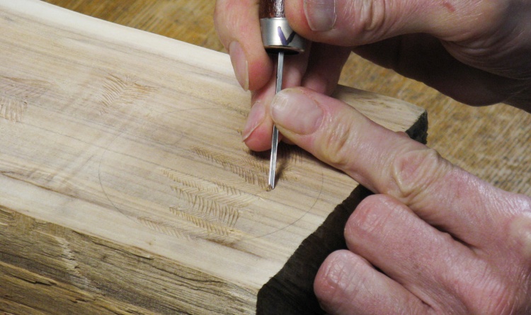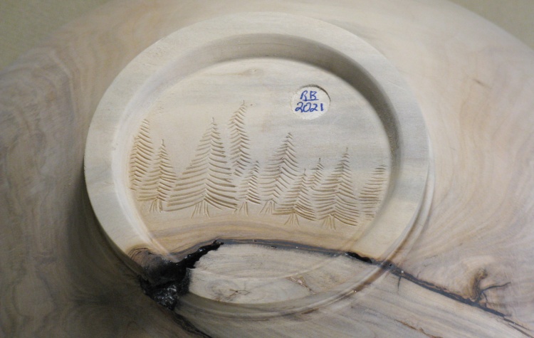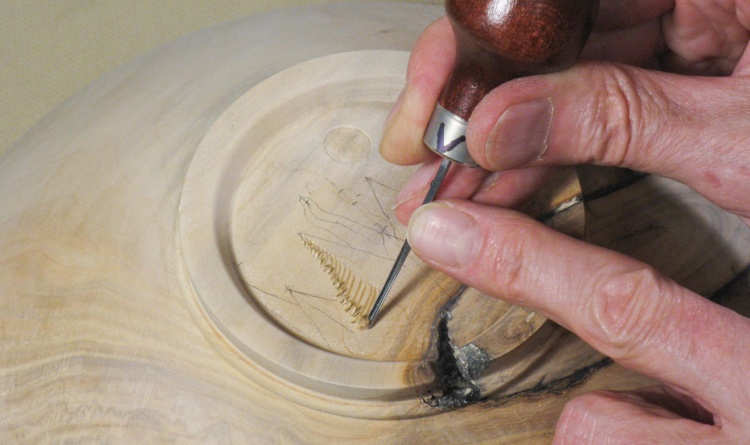 My trial carving worked out fine so I sketched the forest onto the bottom of the bowl and carved it in there.