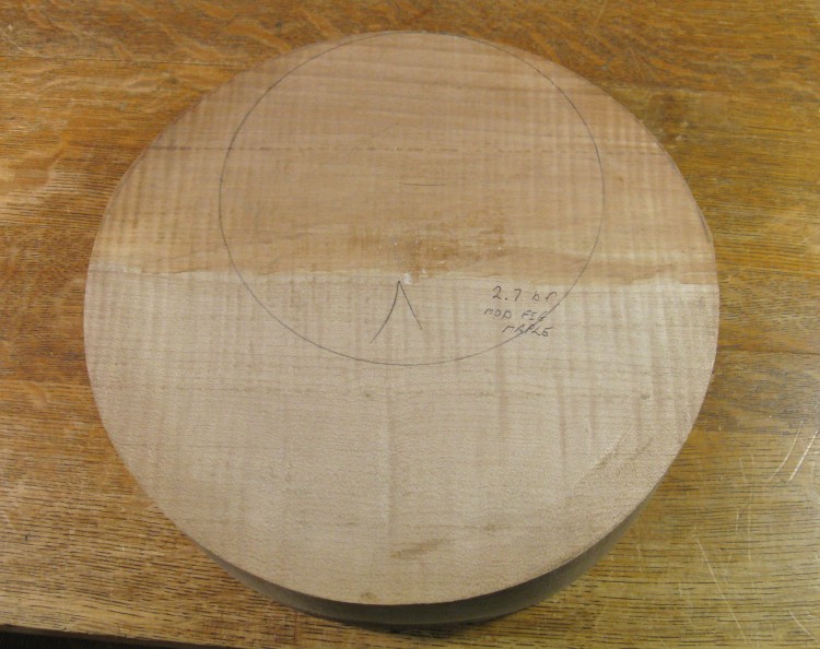 I happened to have a nice wood blank of sufficient size in my shop, acquired a few years ago for a different project I never managed to get around to. That's the piece of Figured Maple shown here and the outline marked on it is the size needed for the yarn bowl.