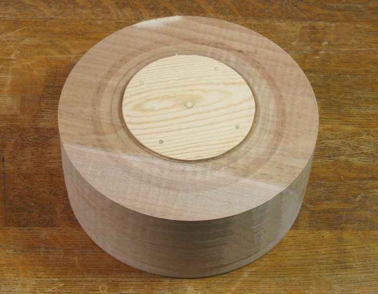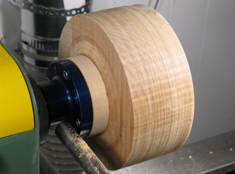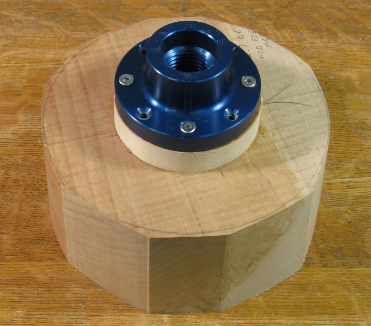 I cut the blank out (rather crudely since I had a wide blade on the bandsaw I didn't want to change for just this one cut). A round wooden mounting block was then glued to the blank and the blue faceplate screwed to the block.